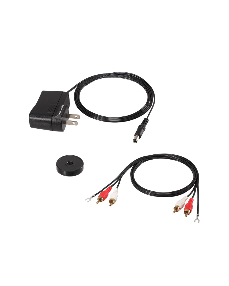 El AT-LP70X viene con un cable RCA desmontable (doble RCA macho a doble RCA macho con toma de tierra), un adaptador de 45 RPM y una cubierta antipolvo con bisagras extraíble.